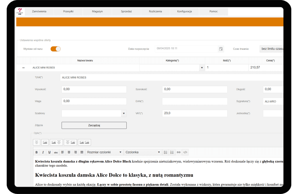 - automatyzujesz dopasowanie produktów do standardów e-commerce z 4 linijek opisu do bogatej formy zachęcającej klienta do zakupu